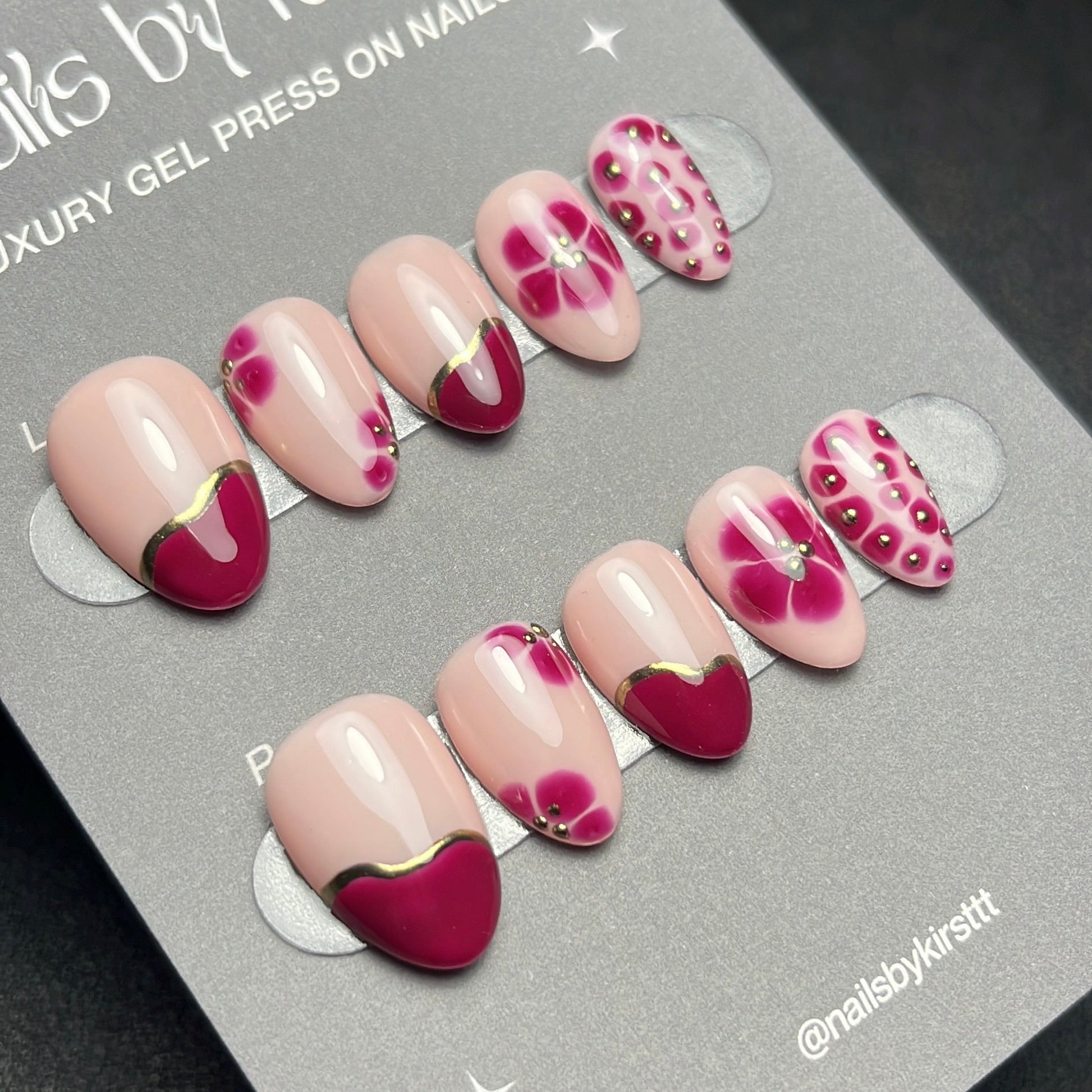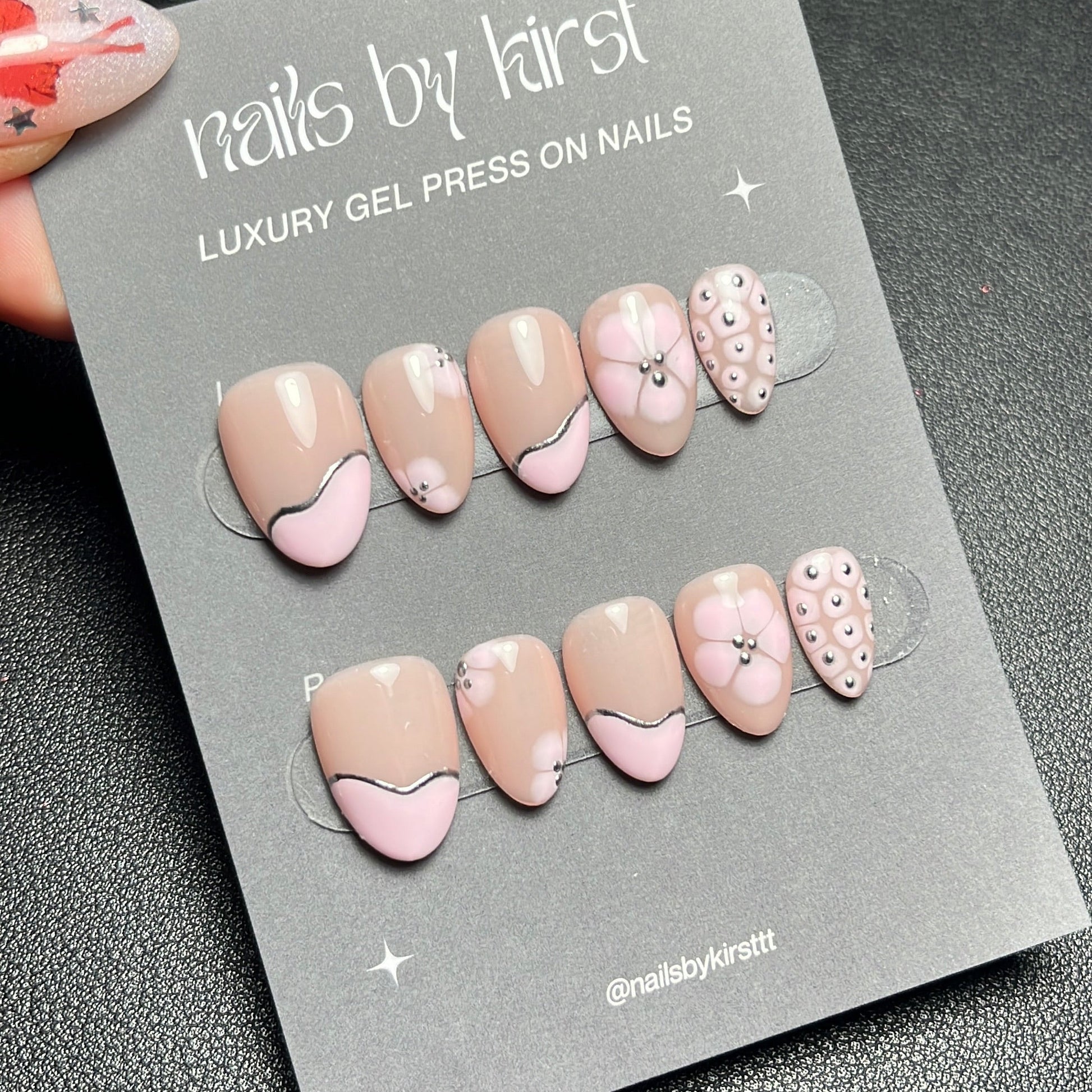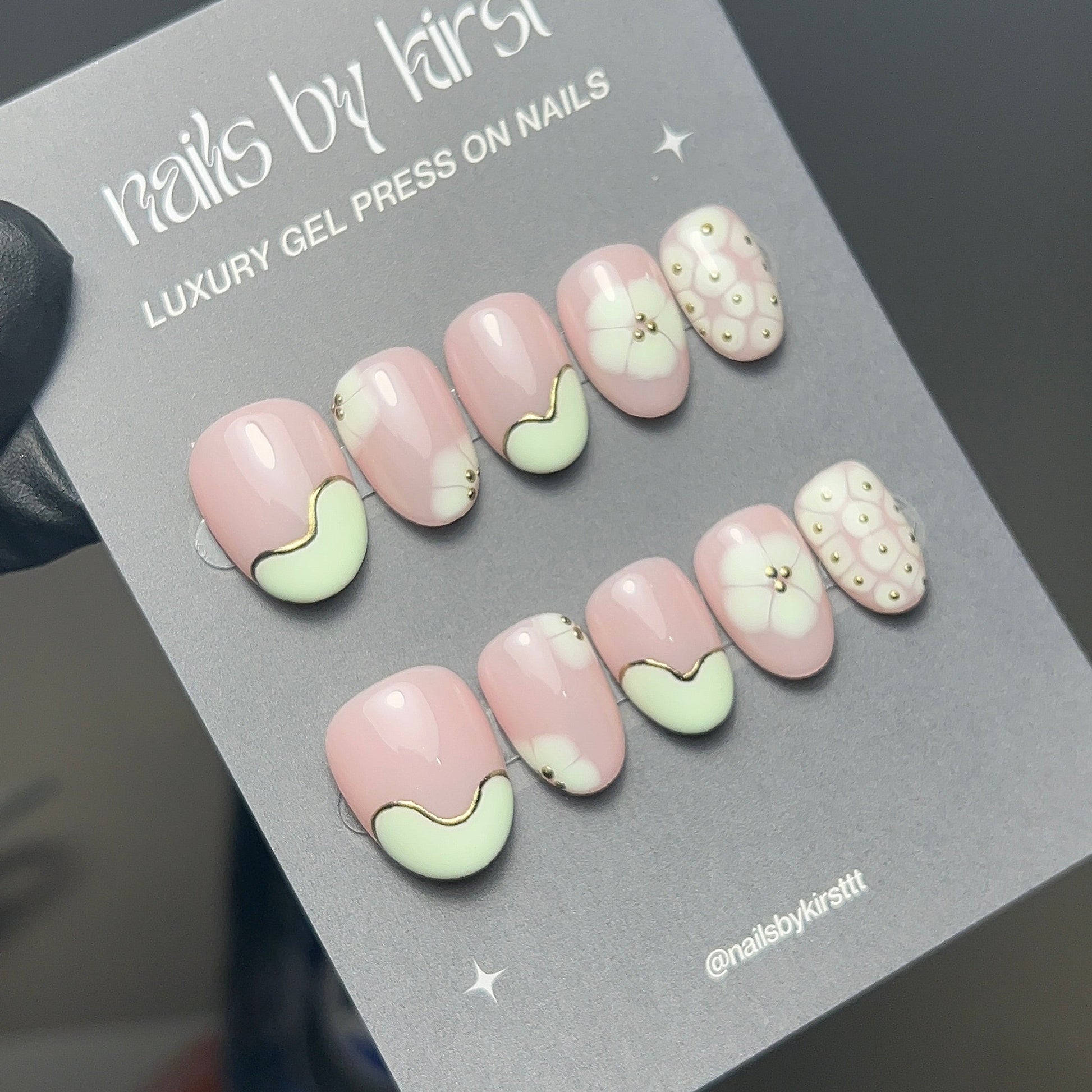 This beautiful floral and abstract press on nail set is back by popular demand! Why not make this design yours by choosing your own gel and chrome colours.